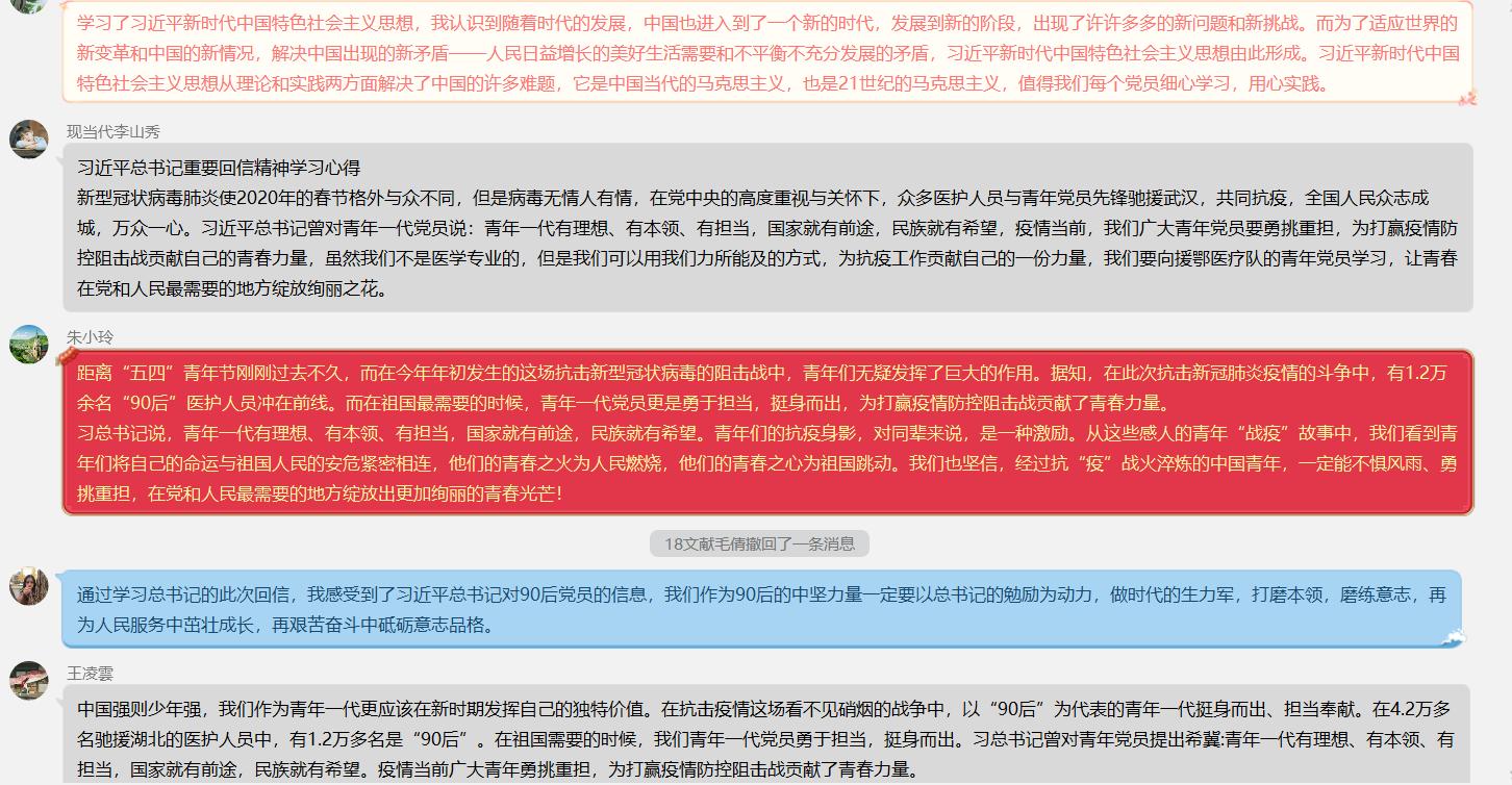 5月6日下午2点,新葡的京集团8814硕士2018级中文党支部在线上顺利开展了本学期第二次线上组织生活会,本次生活会以员工党员线上学习文件,学习PPT,支部成员轮流发言讨论等形式展开,由支部书记叶小维主持,硕士2018级中文党支部全体党员、预备党员参与。