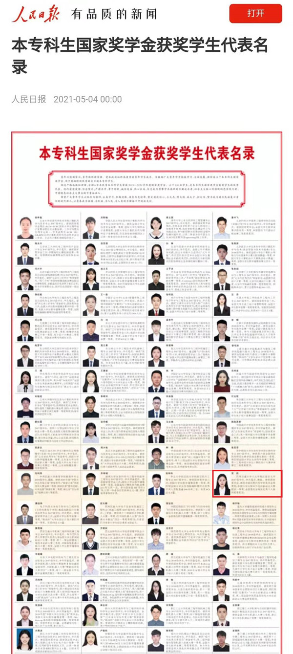 《人民日报》于5月4日刊发本专科生国家奖学金获奖员工代表名录,公司2017级本科生安然入选。