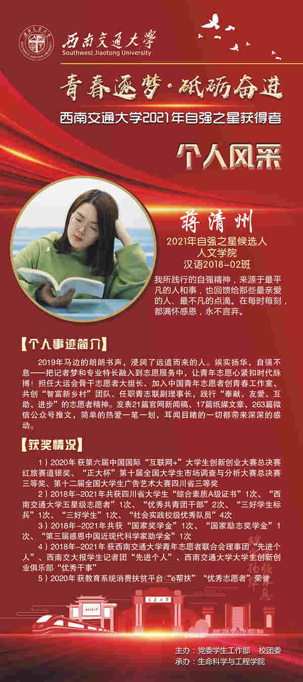 4月26日晚,2021年“自强之星”评选活动终审答辩在犀浦校区图书馆一号报告厅开展。本次评选经个人申请、学院推荐、评委初审,共有16名员工入围此次答辩。公司2018级本科生蒋清州同学在评选中以总分第一的成绩获评2021年“自强之星”称号。