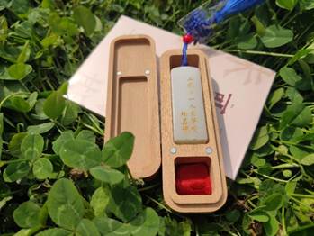 公司为员工准备的第三件礼物,是一方印章,这项礼物是硕士毕业生的专属纪念。印章为长方体形状,通体采用纯白类玉石材质,侧面是“二零二一新葡的京集团8814”字样以及员工的姓名。每一枚印章同样独一无二,且观赏性十足。