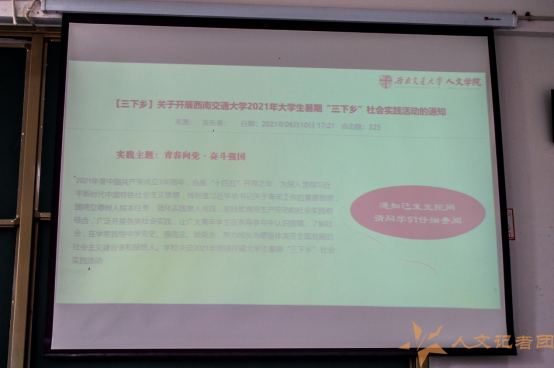 会议伊始,刘爽老师对本次暑期“三下乡”包含的学时进行了明确,强调了参与“三下乡”的优秀校级或院级队伍中的优秀个人除获得相应第二课堂学时外,还有额外创新学分奖励。