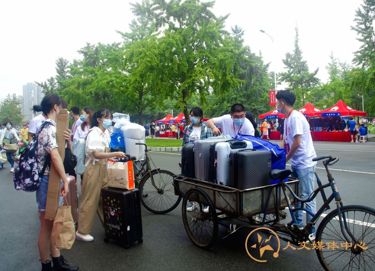 减轻新生的负担,让他们感受到温暖,尽快融入新葡的京集团8814这个大家庭,这是所有迎新志愿者的初心。为了更好地迎接新同学,迎新工作者们借来了三轮车。新生班协姜骅峰同学和常鑫渝同学一趟一趟地搬运着新生的行李,给同学带去了很多便利。