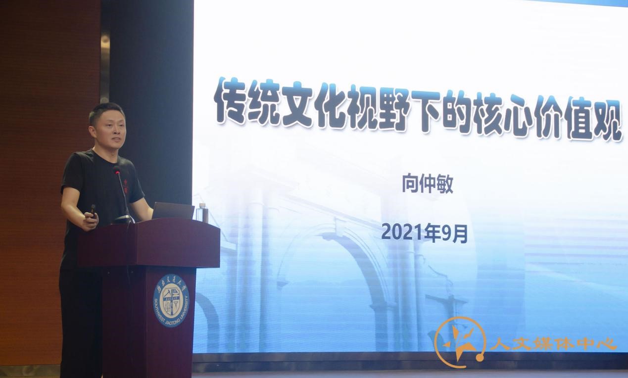 14时17分,新生第一课正式开始。向仲敏书记为同学们带来的新生第一课主题为:传统文化视野下的核心价值观。向书记首先结合时代和社会主义核心价值观向同学们介绍了价值观的重大的现实意义。中国传统文化中蕴含着众多正向的价值观引导,因此,他借助传统文化典籍,从国家、社会、个人三方面向同学们介绍核心价值观的内容。
