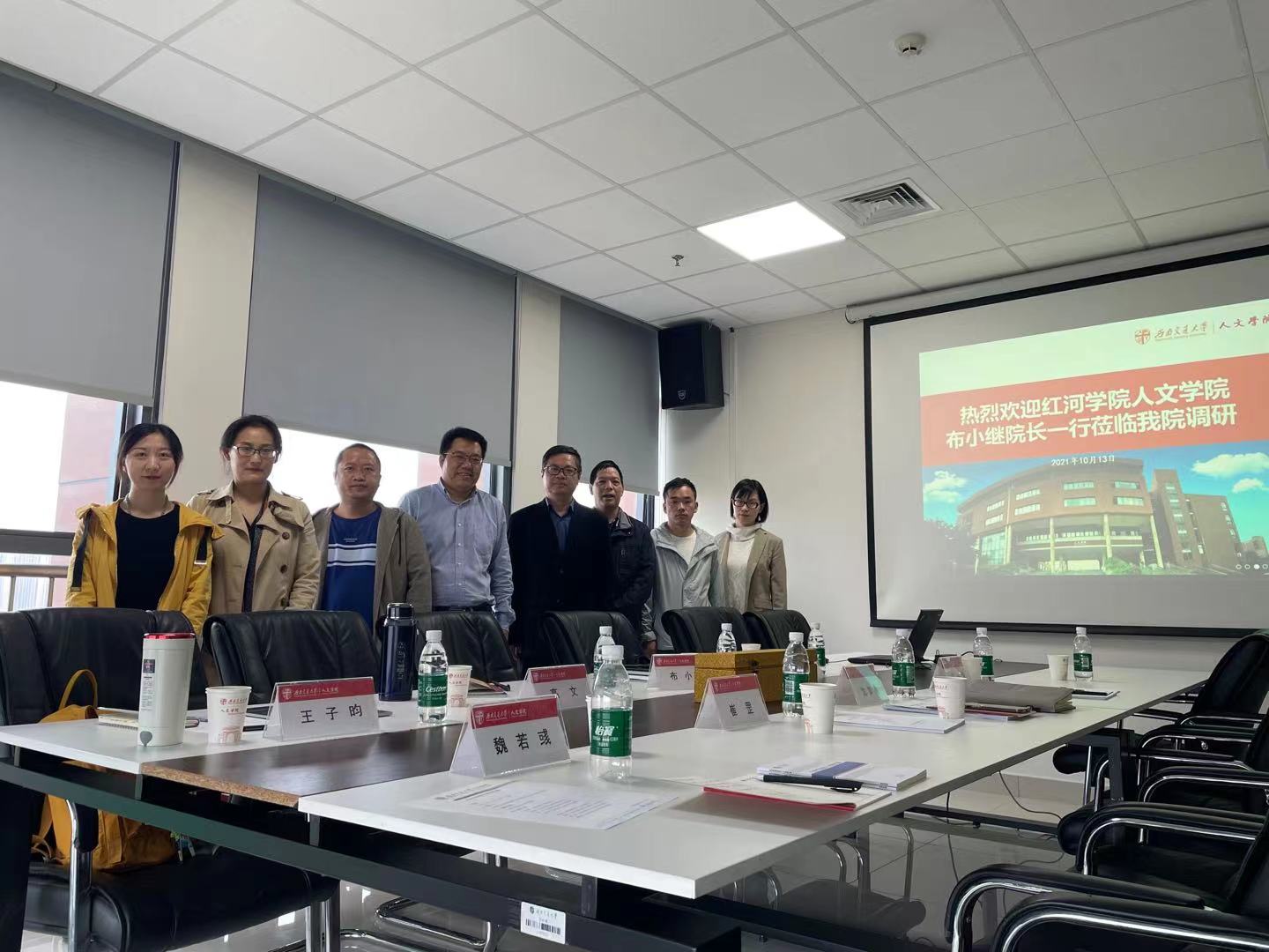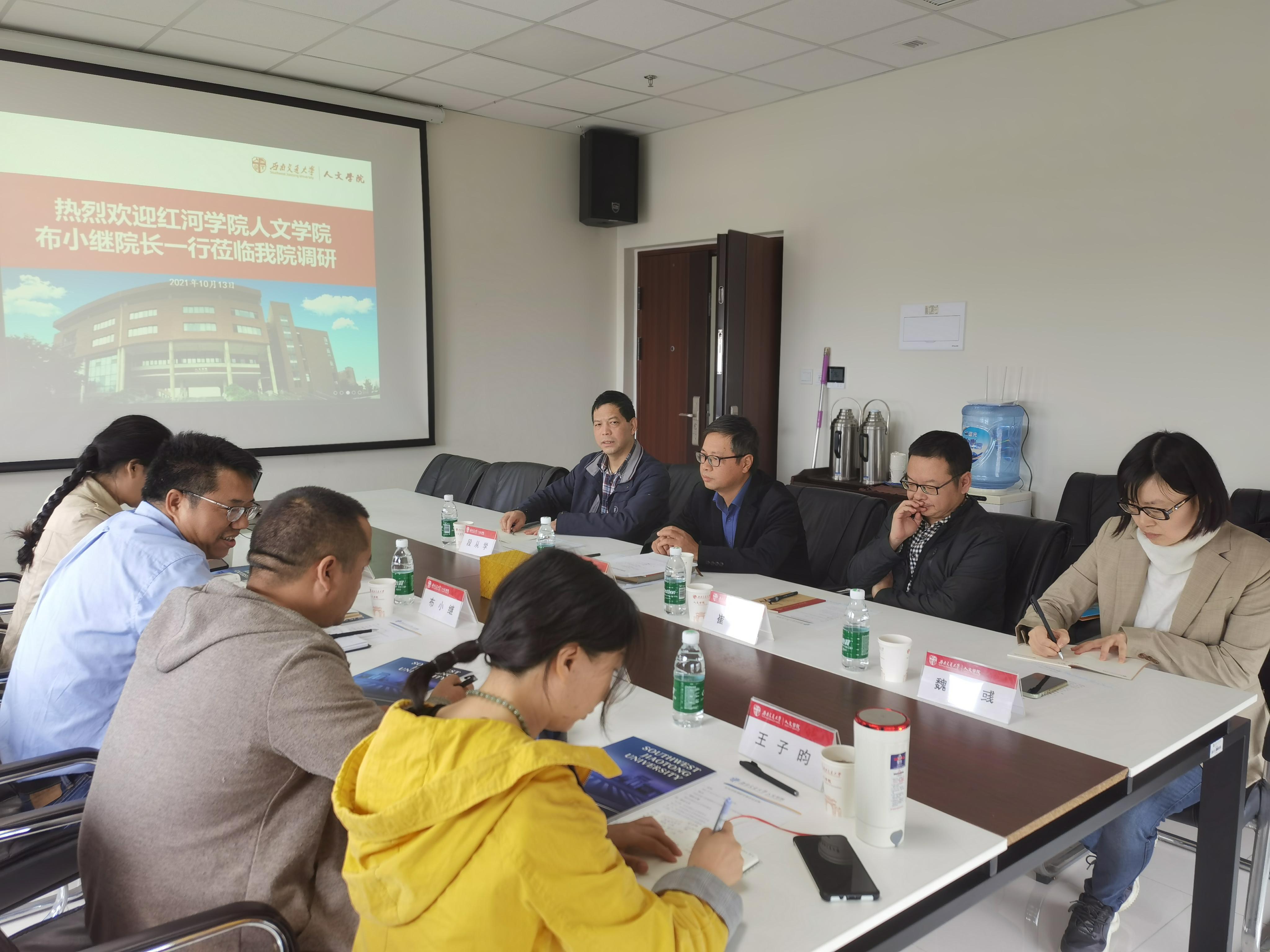 2021年10月13日下午2:30,红河学院新葡的京集团8814布小继经理一行四人到公司调研交流。学院沈如泉副经理、中文学科带头人段从学、哲学所所长崔罡、学科秘书魏若彧参加调研会。