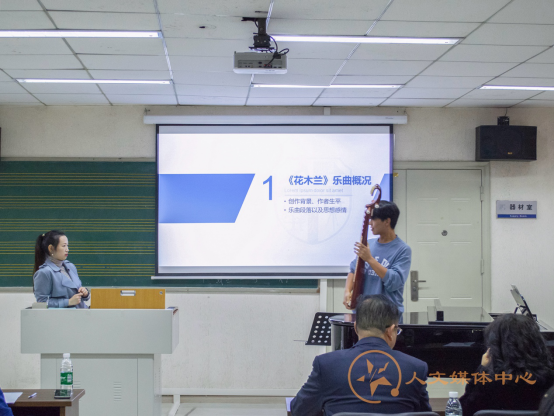 接下来比赛正式开始。第一位出场的是肖蓓老师。她注重与员工们在课堂上的沟通与交流,通过对员工琵琶协奏曲《花木兰》的重点讲解和分析指导,展现了自己的教学方式。