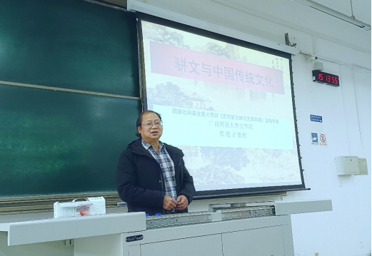 2021年10月23日下午,国家社科基金重大项目《历代骈文研究文献集成》首席专家、广西师范大学文学院莫道才教授应邀来公司,为同学们作了题为“骈文与中国传统文化”的讲座。本次讲座由中文系刘玉珺教授主持。