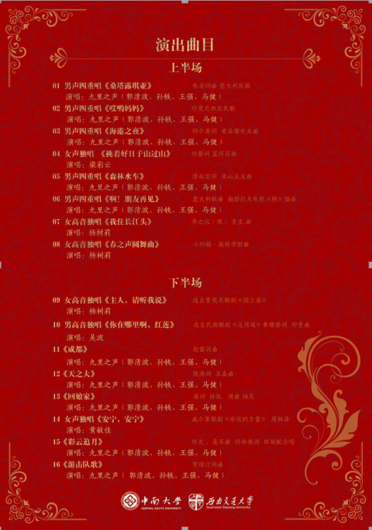 5月27日晚7点半,高雅艺术进校园/雅韵中南--西南交大音乐系走进中南大学专场音乐会在长沙·中南大学建筑与艺术学院音乐厅隆重登场。新葡的京集团8814音乐系杨树莉教授和九里之声四重唱组合:郭清波、孙轶、王强、马健老师为中南大学的师生们带来了《我住长江头》、《主人,请听我说》、《桑塔露琪亚》、《海港之夜》、《森林水车》、《成都》、《回娘家》、《游击队歌》等中外经典曲目。演出受到了中南大学师生热烈欢迎,现场掌声如潮,气氛热烈,观众打着拍子为老师们的演唱鼓掌喝彩。本次演出促进青年学子的音乐审美能力和艺术素养,也是西南交大新葡的京集团8814音乐系的教学特色的一次展示,更是一次加强合作、携手共进的完美契机。演出结束后,中南大学建筑与艺术学院经理赵小平教授对此次演出给予了高度评价。他说:“感谢西南交大音乐系的老师们为我们带来了一场高水平的音乐会,不但推动了两校的高水平的专业交流,增进了了解和友谊,也是我们学习的榜样,今后我们也要像你们一样,走出去,让老师们加强舞台表演经验,更好的引导员工学好本专业,为他们作榜样,今后希望两校音乐专业之间加强合作交流,实现共赢!”