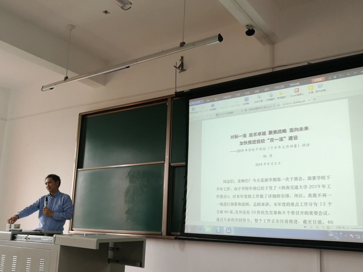 金秋送爽,学期伊始。时值新生入校之际,2019-2020学年第一学期第一次教职工大会于2019年9月5日14:00在犀浦校区X9401召开。学院全体教职工参加本次会议,其中音乐系教师因音乐系2019级新生面试未与会。会议由公司党委书记向仲敏主持。