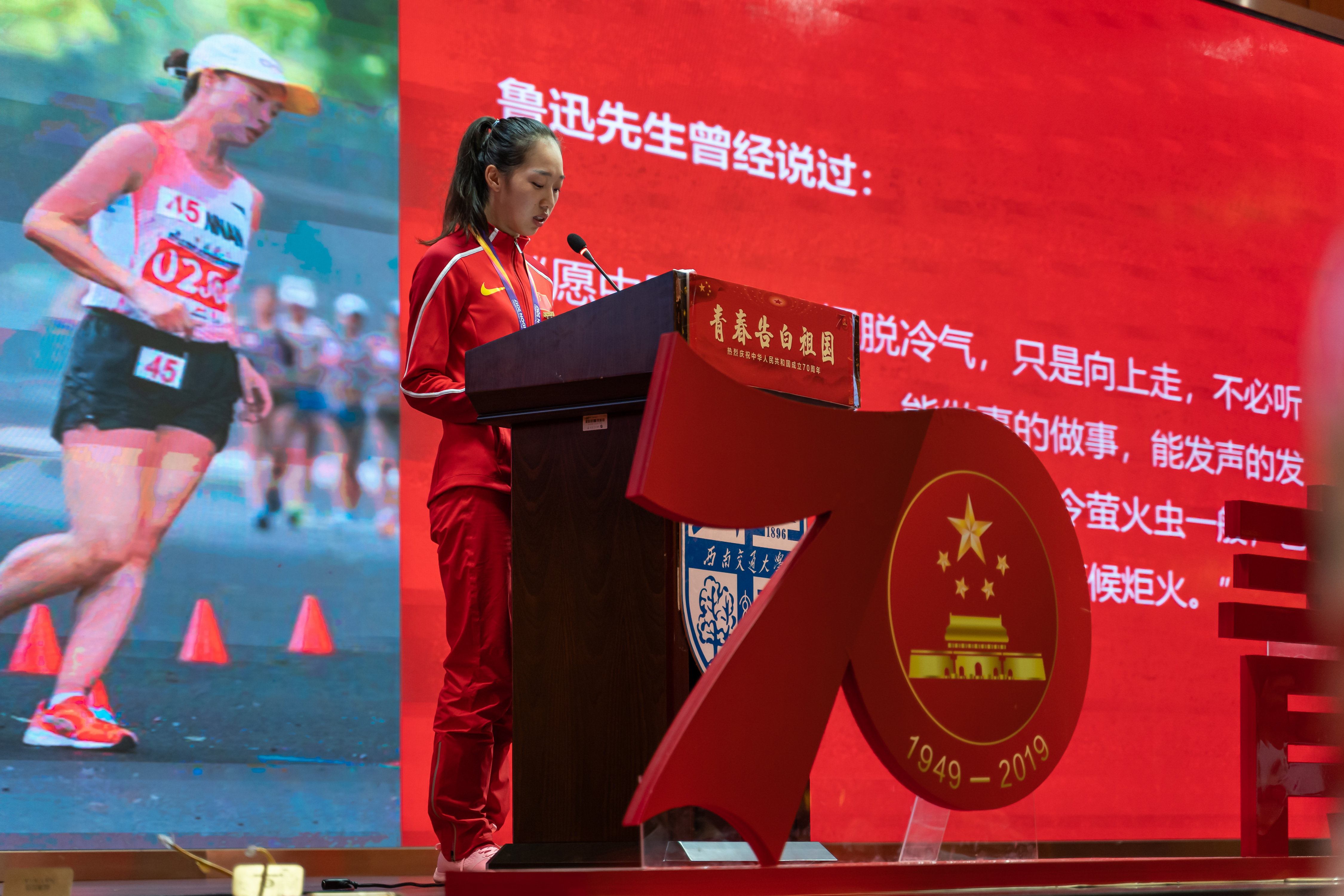 杨树青是公司2019级新闻传播专业新生,她曾在2017年世锦赛赛场上勇夺竞走季军。身披国旗为国争光的背后,是枯燥乏味、漫长艰辛的训练。晕倒、拉伤、贫血都没有打败杨树青,她克服了思乡之苦和追求体育梦路上的种种嘲讽与质疑,怀着一颗为国征战、回报祖国的赤子之心坚持“走”了下去。五星红旗让她有机会站上世锦赛的赛道,更赋予了她拼命向前、势不可挡的意志。她高呼“中国体育有我,有千千万万体育人”时眼含泪花,饱含对在背后培养、支持她的祖国的无尽感激。现场掌声雷动,现场师生都被这份热忱深深打动。