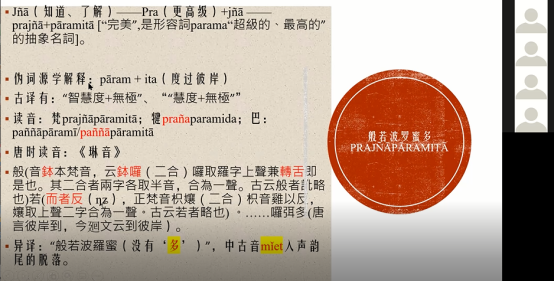 7. 《金刚经》:1)罗什:创造性的用五千言重新书写了般若波罗蜜多思想,六种汉译里面最流行的是鸠摩罗什译的《金刚般若波罗蜜多经》。2)达摩岌多译本《金刚能断经》:怪异,语言不通的一个译本,纪老师利用梵语知识,解释此译本原是一个针对梵文原本每个句子中各个单词译出的半成品,可能是因为后期达摩岌多因为战乱等故,并没有来得及将单词最终按照梵文性数格和句法结构组合起来“回缀”,形成完整的可以理解的中文句子。例如根据汉语的主谓宾的语序,应该是“应说名”,而梵语的语序一般是宾语置于动词之前,因为没来得及调整成汉语的语序,所以岌多的译本就出现了“名说应”这样怪异的梵语语序。3)在介绍左冠明老师的研究时,纪老师特意关注了罗什译本和玄奘译本关于“相”和“想” 译文有何不同。左老师结论是,玄奘的译本中,关于想的翻译是来自于“想蕴”(Saṃjñā),或者“想阴”,属于色受想行识五蕴中的一种,是一种心理活动。而罗什译本里面翻译成了“我相、人相、众生相、寿者相”,“相”这个译法主要侧重于其名词词义:“想法”,而不是具体的心理活动这个动作,而这种翻译传统,则是与说一切有部的解经传统有关。4)通过几个译本的对比,纪老师还指出,玄奘可能在翻译过程中喜欢增加词句,不遵循原文,这一点是值得注意的。