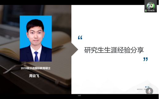 在第二部分“砥砺研途”中,2018级汉语国际教育硕士周云飞主要从学习经验、论文选题、实习建议三个方面向同学们分享了自己研究生生涯的一些经验与建议。