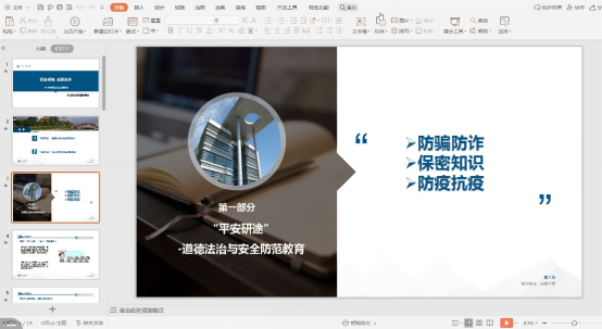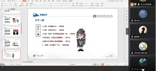 本次主题班会的内容主要分为“平安研途”与“砥砺研途”两部分。在“平安研途”部分中,2020级传播哲学班班长李江月从“防骗防诈”、“保密知识”、“防疫抗疫”三个方面展开阐述。
