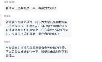 最后,同学们对周云飞学长的分享表示非常感谢,并积极发表了自己的所感所悟。如闻英同学感叹道:“读研两个月来,一直都处在迷茫之中,学长刚刚在未来职业规划上以及面对事情的取舍上给了我很多启发,在未来的时间里,相信自己面对这些问题会有更清晰的认识。”杨谨瑜同学表示:“我认为还是要找准自己的目标定位,把时间花在自己感兴趣和对未来职业规划有帮助的事情上。”周桎宏同学也认为:“学长分享的经验和心得是很有参考价值的干货。”