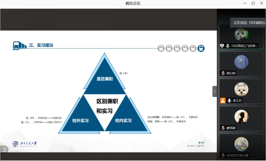首先在学习经验方面,周云飞强调记录课堂笔记时纯文字跟不上速度,纯照片也缺乏整理过程和效果,建议学会利用APP高效整合笔记。并且建议同学们积极参加各种学术会议,关注学术前沿热点。其次在论文选题方面,周云飞结合自身研究方向讲述选题的重要性,强调选题一定要自己有兴趣。最后在实习建议方面,最好从事与专业相关或有目标方向的工作,避免盲目追求没有实际意义的工作。校内实习要多关注消息来源,如老师、学院发布的各类实习岗位等。校外实习要去专业的大公司或者机构,能大大提高自己的工作能力。