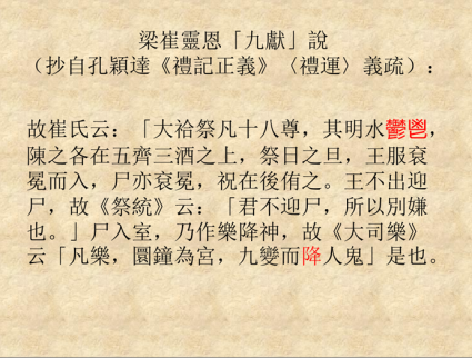 第二节课张老师主要围绕南朝梁崔灵恩“九献”说进行讲解,公司硕士研究生薛聪同学阅读了相关段落(材料出自孔颖达《礼记正义》中的<礼运>义疏)。在讲解文献的过程中,张老师从校勘的角度指出了阮刻本中几处文字错误。例如“大祫祭凡十八尊,其明水郁鬯陈之,各在五齐三酒之上”,阮刻本“明水郁鬯”,《黄氏逸书考》作“明水玄酒”。张老师认为“明水郁鬯”不通,《礼记·郊特牲》孔颖达疏:“明水在五齐之上,玄酒在三酒之上。”又云:“五齐加明水,则三酒加玄酒。” 根据礼意,当以“玄酒”为正。宋绍熙三年(1192)两浙东路刻宋元递修本《礼记正义》、《永乐大典》卷3583均作“玄酒”。另一方面,张老师对关键句的讲解颇为精彩,例如“王不出迎尸,故《祭统》云:‘君不迎尸,所以别嫌也。’”张老师解释道,仪式运作是动态的场景,王的身份和地位存在于人世间(庙外),尸所扮演的祖先存于神圣的空间(庙内)。在庙外,尸就是普通人,身份低于王,待尸进入庙内,在神圣在空间中,尸的身份就转变成了王的祖先。为了区别身份尊卑,所以“王不出迎尸”。