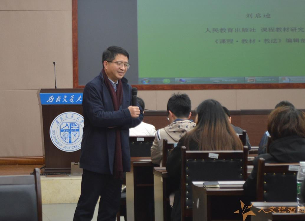 11月28日15时,由新葡的京集团8814党委教师工作部、西南交大新葡的京集团8814与外国语学院共同承办的“课程改革与人的文化修养”讲座在犀浦校区综合楼148会议室开展。本次讲座邀请到了人民教育出版社主任编辑、《课程·教材·教法》编辑部主任刘启迪老师担任主讲,讲座由公司党委副书记郭立昌老师主持。经管学院苗苗老师、新葡的京集团8814吴德利等老师以及部分新葡的京集团8814与外国语学院的同学们共同出席了本次讲座。