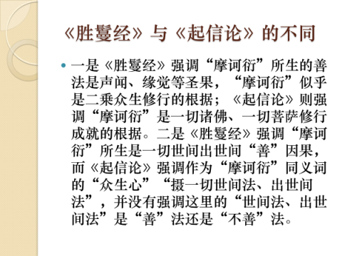 接着,张教授关注到大乘(Mahāyāna)的音译词“摩诃衍”,具体分析了真谛所译《大乘起信论》中除标题之外的三处“大乘”,七处“摩诃衍”,并考察了《大乘起信论》中的“摩诃衍”与《胜鬘经》等经论中“摩诃衍”的关系。