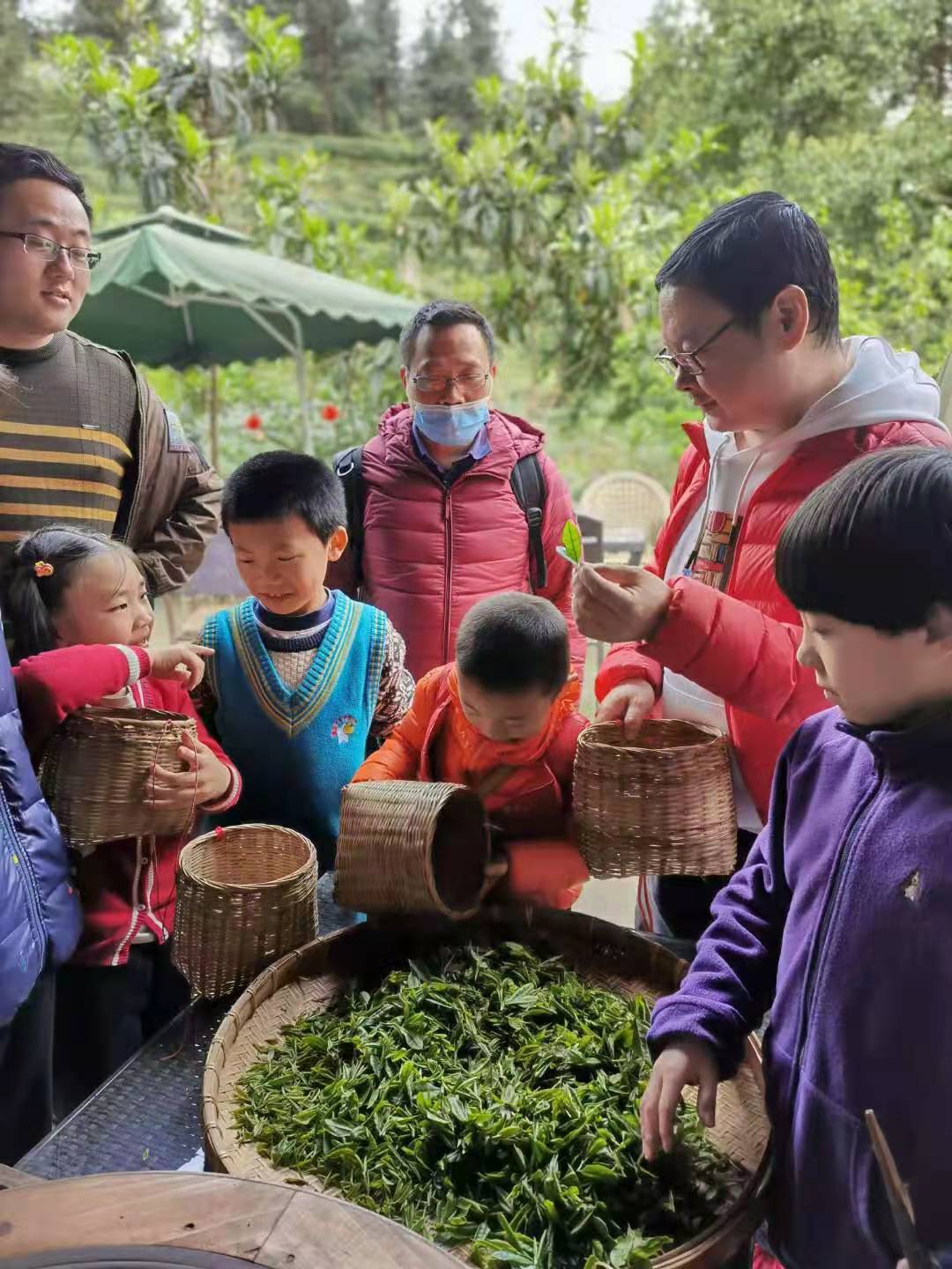 一来到茶园,大家被扑面而来的深深浅浅的绿所倾倒,连空气都似乎染上了温润明媚的颜色。戴上尖尖的斗笠,老师们沿着错落有致的茶山,一边欣赏欣欣向荣的春景,一边跃跃欲试去采茶。开始时还不太习惯,过了不大一会儿,昔日捏惯粉笔的手也可以在颖拔的茶芽上来回飞舞,“一叶一芽”在竹篓里渐渐累积,绿盈盈的,成果颇丰。在享受劳动喜悦的同时,老师们也不禁感叹茶农的不易和劳动的辛苦,平日的一撮茶看似微小,却融入了多少用心。