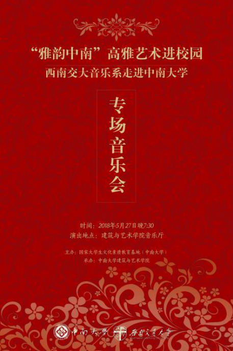 高雅艺术进校园——西南交大音乐系走进中南大学专场音乐会 5月27日晚7点半,高雅艺术进校园/雅韵中南--西南交大音乐系走进中南大学专场音乐会在长沙·中南大学建筑与艺术学院音乐厅隆重登场。新葡的京集团8814音乐系杨树莉教授和九里之声四重唱组合:郭清波、孙轶、王强、马健老师为中南大学的师生们带来了《我住长江头》、《主人,请听我说》、《桑塔露琪亚》、《海港之夜》、《森林水车》、《成都》、《回娘家》、《游击队歌》等中外经典曲目。演出受到了中南大学师生热烈欢迎,现场掌...