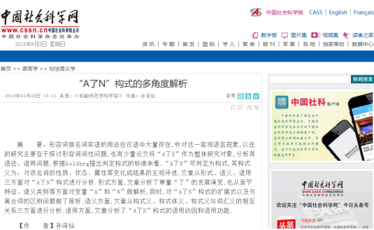 中国社会科学网全文转载公司研究生孙泽仙的论文《“A了N”构式的多角度解析》2018年5月30日,中国社会科学网全文转载了新葡的京集团8814中文系研究生孙泽仙的论文《“A了N”构式的多角度解析》,该论文系公司汪启明教授主持的国家社科基金重大项目“方志中方言资料的整理、辑录和数字化工程”的阶段性研究成果。 该论文从形式、语义、语用三方面对“A了N”构式进行分析。形式方面,文章分析了常量“了”的发展演变,也从音节特征、语义类别等方面对变量“A”和“N”做解析,同时,对“A了N”构式的...