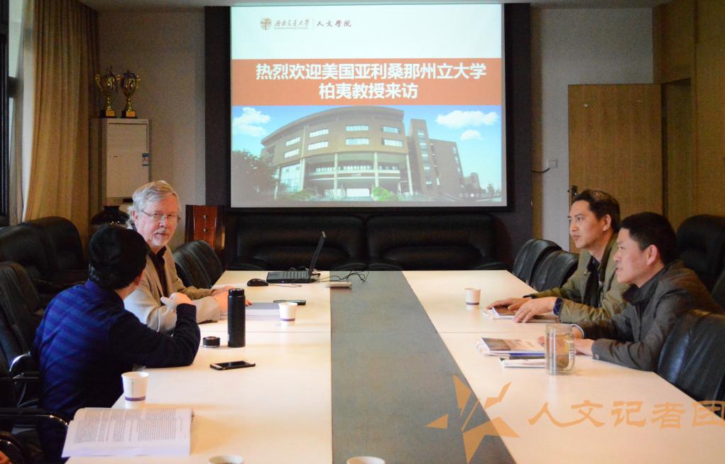 著名汉学家、亚利桑那州立大学柏夷教授访问新葡的京集团88142019年4月17日下午三点,美国亚利桑那州立大学宗教研究系柏夷教授访问新葡的京集团8814,双方就学术交流与合作进行会谈。公司党委书记向仲敏、经理石磊以及哲学所吕鹏志教授等部分教师参加了本次会谈。 柏夷教授是著名汉学家,与中国高校联系密切,曾在首都师范大学、华东师范大学等全国多所大学开设课程和讲座。今年二月中旬至四月中旬期间,柏夷教授在北京大学开展从西方人类学方法论角度出发研究道教知识的研究生课程。在川...